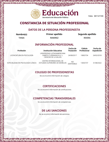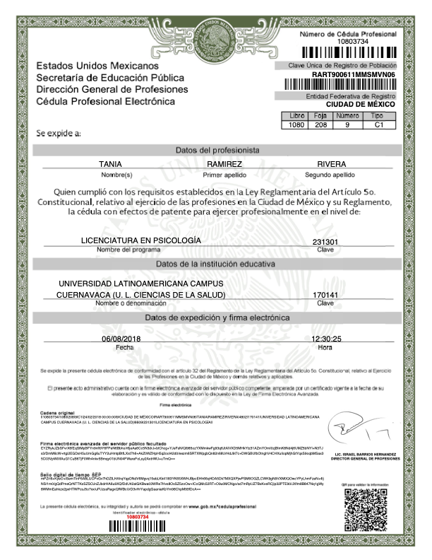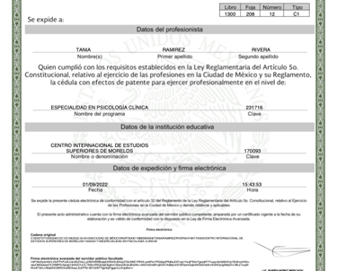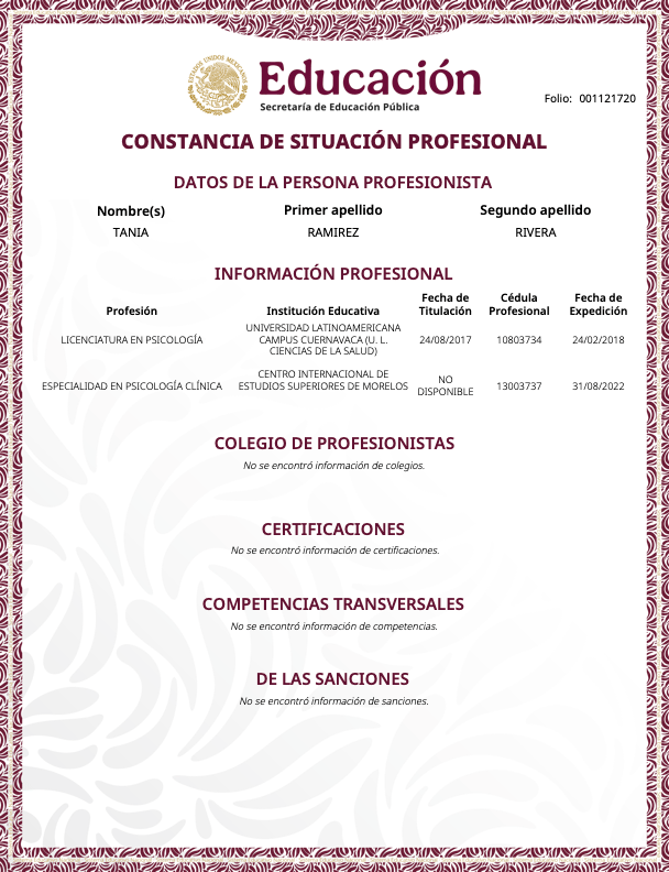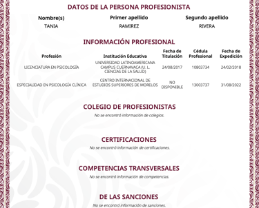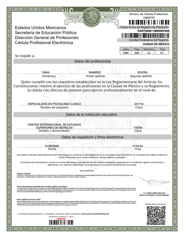 En la vida profesional, soy psicóloga egresada de la Universidad Latinoamericana ULA, con una Especialidad en Psicología Clínica por el Centro Internacional de Estudios Superiores CIES y Maestra en Terapia Cognitivo Conductual desde Diciembre 2024, por el Centro de Psicoterapia Cognitiva de Cancún, la única institución en México avalada por "The Academy of Cognitive and Behavioral Therapies", actualmente me encuentro en proceso de Titulación, además estoy cursando un Diplomado en Terapia de Esquemas, también en el Centro de Psicoterapia Cognitiva.
